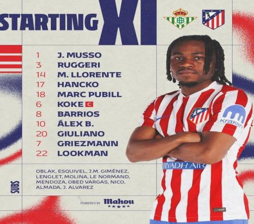馬競首發:1-穆索、14-馬科斯-略倫特、18-普維爾、17-漢茨科、3-魯杰里、20-小西蒙尼、8-巴里奧斯、6-科克、10-巴埃納、7-格列茲曼、22-盧克曼