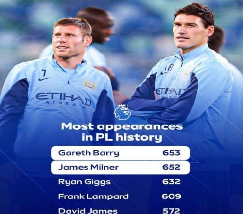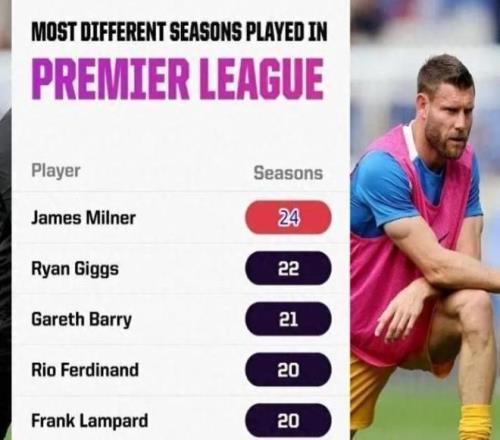 米爾納早已超越吉格斯、巴里和費迪南德等名宿,成為英超歷史上出場賽季最多的球員-9。當這兩項紀錄集于一身時,這位曾在曼城和利物浦獲得英超冠軍、在利物浦贏得歐冠獎杯的傳奇球員,將被永遠鐫刻在英超豐碑上。