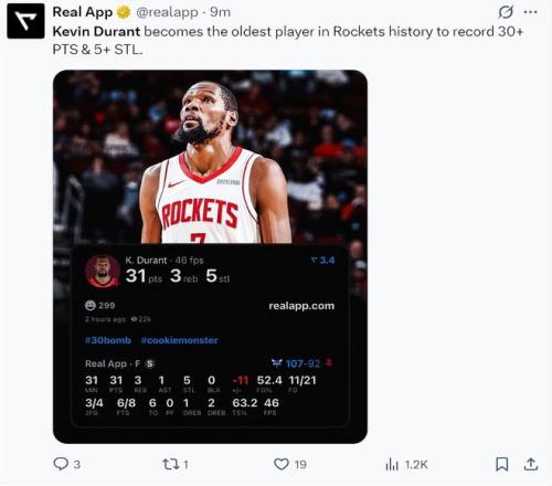 杜蘭特此役三節打卡31分鐘,21中11,三分4中3,罰球8中6,拿到31分3籃板1助攻5搶斷,命中率52.4%,三分命中率75%,杜蘭特成為火箭隊隊史年齡最大的30+5搶斷先生。