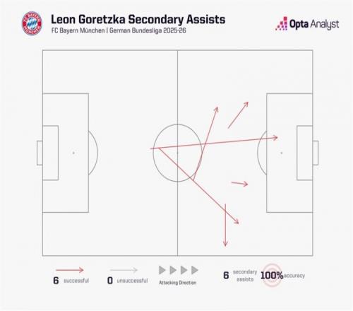 Opta指出,本賽季德甲聯(lián)賽,格雷茨卡送出6次進(jìn)球之前的倒數(shù)第二傳,所有德甲球員之中最多。