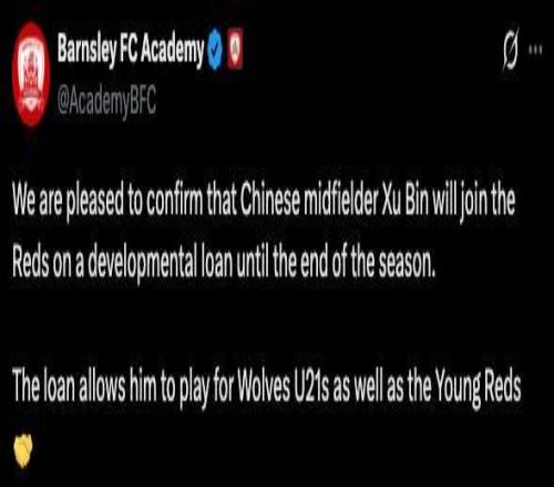 巴恩斯利青訓(xùn)學(xué)院的官方公告是:“我們很高興地確認(rèn),中國(guó)中場(chǎng)球員徐彬?qū)⒆鳛榘l(fā)展性租借球員加盟巴恩斯利,租借期將持續(xù)至本賽季結(jié)束。這筆租借將允許他同時(shí)代表狼隊(duì)U21及巴恩斯利青年隊(duì)出戰(zhàn)。”