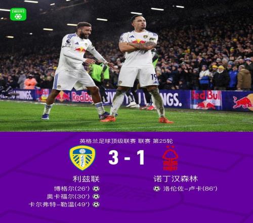 北京時間2月7日英格蘭足球頂級聯賽 聯賽 第25輪,利茲聯主場對陣諾丁漢森林。利茲聯博格爾破門,奧卡福爾破門,卡爾弗特-勒溫破門。諾丁漢森林洛倫佐-盧卡破門。最終比分利茲聯 3-1 諾丁漢森林。