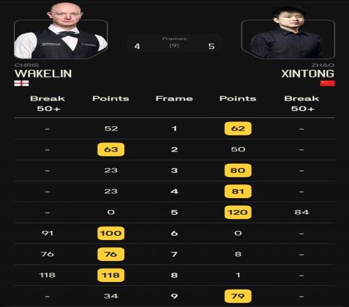 趙心童隨后打出單桿84分,4-1率先拿到賽點!之后韋克林找回手感,接連打出91、76分,將比分追到3-4,在第8局單桿破百,扳成4-4平。