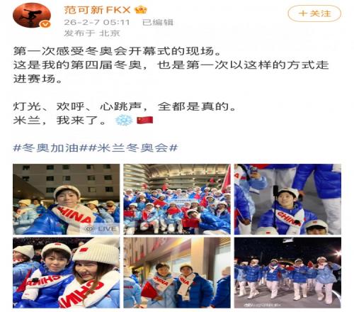 開幕式結束后中國短道速滑名將范可新在社媒曬出亮相開幕式照,并配文寫道: