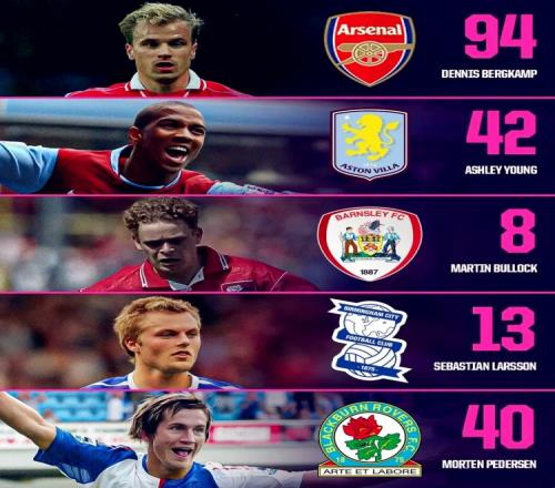 巴恩斯利只有一個賽季的英超經歷,頂級聯賽助攻王是布洛克(8次助攻)。