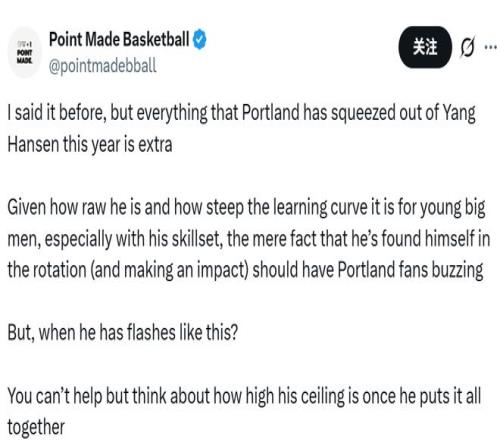 美媒Point Made Basketball寫道:“我之前就說過,開拓者今年能從楊瀚森身上挖掘出這么多價值,已經算是意外之喜了。考慮到他尚且稚嫩的技術功底,以及年輕內線球員本就陡峭的成長曲線 —— 尤其是結合他的技術特點來看 —— 他未來不僅能穩穩進入球隊輪換陣容,還能打出實實在在的影響力,單是這一點就足以讓開拓者的球迷們興奮不已了。可要是看到他打出這樣靈光乍現的表現呢?你就會忍不住去暢想,一旦他把所有技術能力融會貫通,未來的上限究竟能有多高。”