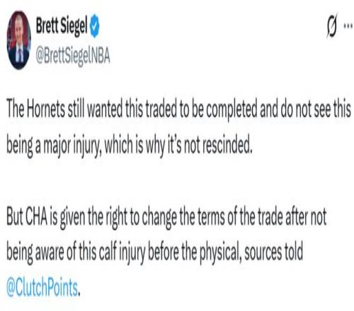 消息人士透露,由于在體檢前不知道這名球員的小腿受傷,黃蜂有權(quán)更改交易條款。