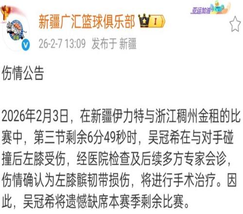 然而新疆男籃還是得到了壞消息,根據球隊方面的官方消息,內線大將吳冠希由于膝蓋傷病遭遇賽季報銷。這對于新疆男籃來說打擊不小,畢竟內線原本就只有勞森一名外援,李炎哲受傷后狀態一直都不理想,按照目前的情況來看,新疆男籃有可能會補充一名大外援。