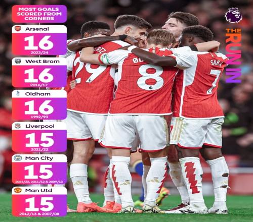 本賽季前24輪英超聯(lián)賽,阿森納通過角球取得了14粒進球,這一數(shù)據(jù)冠絕聯(lián)賽。
