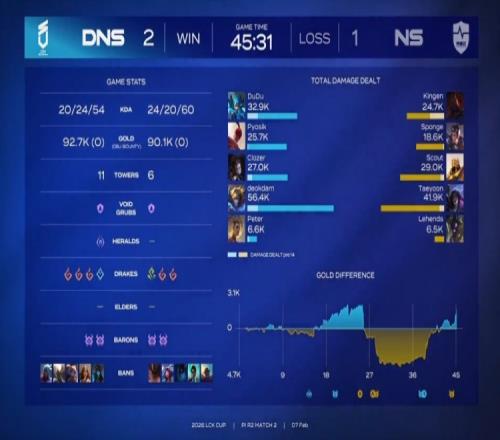 后期大龍團,Kingen賽恩殘血后撤,DNS拿到大龍,Lehends牛頭擊飛DNS四人,Scout沙皇雙殺,deokdam戰至最后擊殺Taeyoon卡莎,DNS打出3換5團滅NS,雙方經濟再度持平。