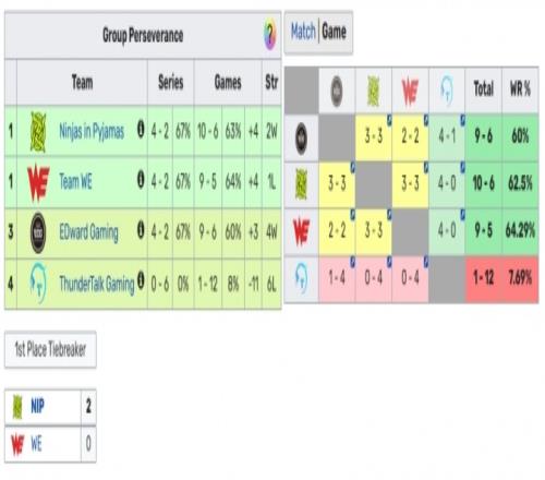 NIP贏下加賽確保組內(nèi)頭名(5勝3負(fù)),WE第二名(4勝3負(fù)),EDG第三名(4勝2負(fù)),TT則是六場(chǎng)全敗(甚至只贏了一個(gè)小局)。