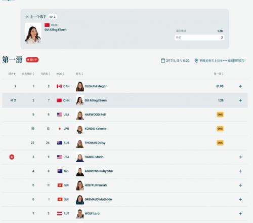 晉級(jí)規(guī)則:預(yù)賽共26名選手參賽,所有選手進(jìn)行兩輪滑行,取單輪最佳成績(jī)排名,總排名前12名晉級(jí)決賽。第2輪預(yù)計(jì)將于稍后18點(diǎn)35分開始。