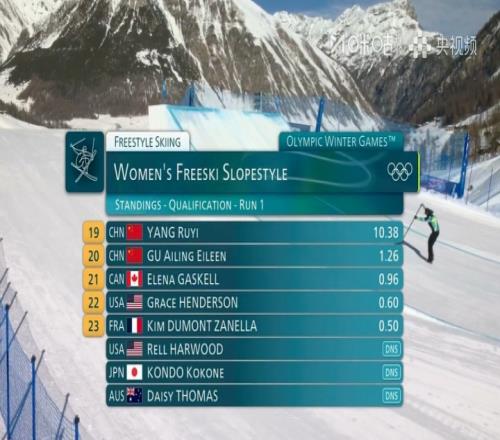谷愛凌第二順位出發,在落地時失去平衡摔倒。隨后她堅持完成整套滑行,結束這一跳,得分1.26分。目前排在第20位。