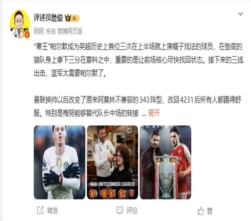 體育播報02月08日宣 本輪曼聯2-0熱刺,阿森納3-0桑德蘭,切爾西3-1狼隊。賽后評述員詹俊發文。
