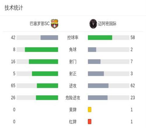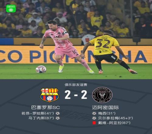 北京時間2月8日俱樂部友誼賽,巴塞羅那SC對陣邁阿密國際。上半場,梅西一條龍破門,之后對手由羅哈斯扳平,補時階段梅西助攻貝爾泰拉梅再次領先。下半場,比賽尾聲階段阿亞拉染紅,之后馬丁內斯扳平比分。。最終比分巴塞羅那SC2-2邁阿密國際。