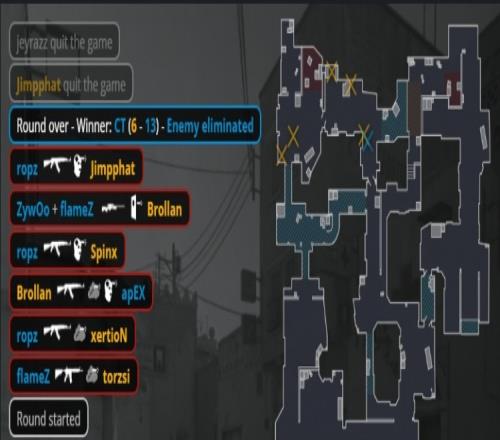 第16回合,火仔A大門前頂打掉小吉米,MOUZ槍械不全四人中路夾B,ropz在B狙擊位三殺到手,小蜜蜂拿到第11分。
