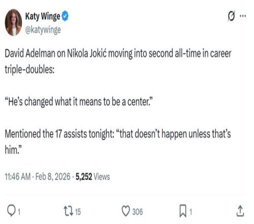 掘金主帥小阿德爾曼談及約基奇全場17次助攻時坦言:“他重新定義了中鋒的意義,也就是他,否則這種情況不會發生。”