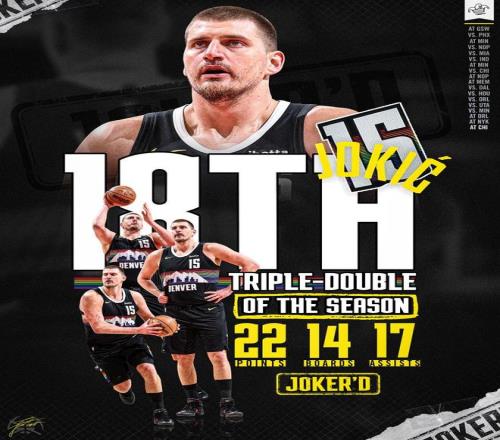 除了三雙數升至歷史第二之外,本場送出1次搶斷后,約基奇還迎來生涯1000次搶斷里程碑,單場送出4次封蓋也創造個人賽季新高。