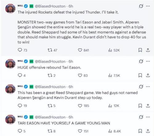 休媒Will寫道:殘陣火箭擊敗殘陣雷霆我覺得挺好的,伊森與小賈雙鋒線表現都在線,申京再一次向全世界球迷證明自己是一位全能型的球員拿到三雙,謝潑德面對壓迫性防守時打出最佳狀態。就這樣下去,我們不需要杜蘭特大包大攬拿40+也能贏球。