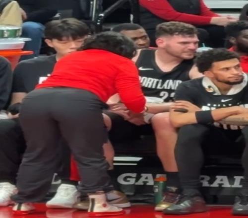 克林根首節(jié)兩手均受傷,隊(duì)醫(yī)處理時楊瀚森坐在旁邊