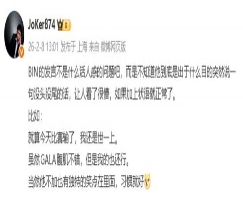 體育播報2月8日宣 前LPL解說Joker發文談Bin動態: