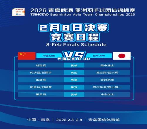 體育播報2月8日宣 2026亞洲羽毛球團體錦標賽男團決賽中國VS日本的對陣出爐,胡哲安作為一單出戰。