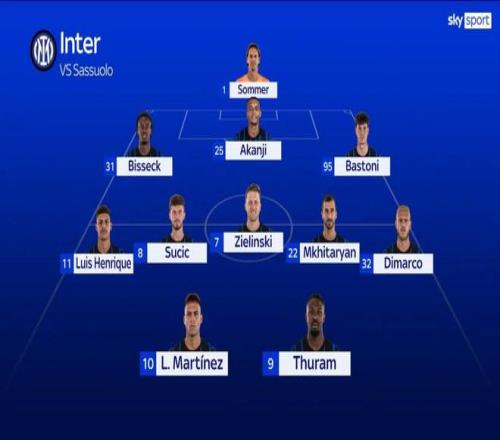 國(guó)米周中在意杯中大輪換贏下都靈,絕大部分主力都得到了良好輪休,只有小圖拉姆出場(chǎng)時(shí)間超過(guò)了45分鐘,而且下一場(chǎng)國(guó)家德比又是6天之后,所以本場(chǎng)比賽并不存在體能問(wèn)題和輪換需要,球隊(duì)可以全主力出戰(zhàn)!因?yàn)榍柡箠W盧、巴雷拉和鄧弗里斯三名主力還未復(fù)出,所以國(guó)米只能排出目前理論上的最強(qiáng)陣容,相信大家對(duì)此都不會(huì)有質(zhì)疑,接下來(lái)就看薩索洛能否經(jīng)得起這套陣容的檢驗(yàn)了!