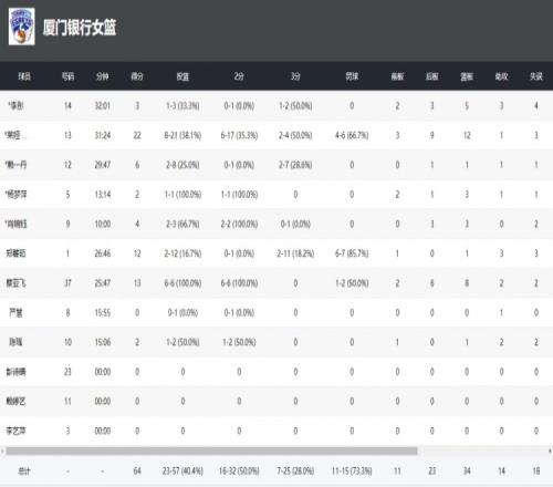 球隊方面,廈門銀行投籃命中率與對手相差不大,但三分球命中率28%比對手37.5%低,且命中個數也比對手少5分;總籃板數雙方一樣多都是34個,前場籃板也差不多;助攻方面廈門女籃14-12還多2次;失誤方面,廈門銀行出現18次,而北京女籃僅9次。球員方面,外援馬歇爾依然拿到22分12籃板的兩雙,但投籃21中8效率不高;國內球員蔡亞飛最為亮眼6投全中拿到13分8籃板;鄭馨茹雖然有12分入賬,但三分11中2;另外賴一丹、楊夢萍、李彤、肖婉鈺和陳瑤等球員都有得分入賬。