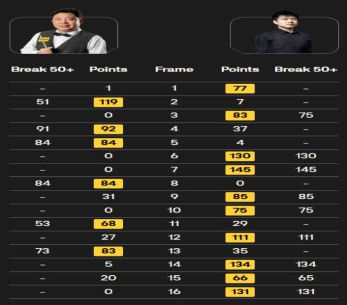 趙心童全場打出五桿破百(130、145、111、134、131)和四桿50+(75、85、75、65),張安達打出六桿50+(51、91、84、84、53、73)。