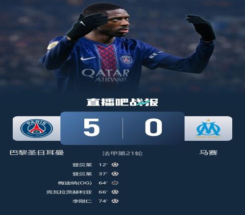 體育播報2月9日宣 北京時間2月9日凌晨3:45,2025-26賽季法甲聯賽第21輪焦點戰,巴黎圣日耳曼坐鎮王子公園球場迎戰馬賽。上半場登貝萊雙響,巴黎圣日耳曼暫2-0馬賽;下半場若昂·內維斯造成梅迪納烏龍,克瓦拉茨赫利亞替補建功,李剛仁鎖定勝局,德羅首秀,最終巴黎圣日耳曼5-0馬賽,贏下法國國家德比,取得兩連勝,2分優勢領跑積分榜。