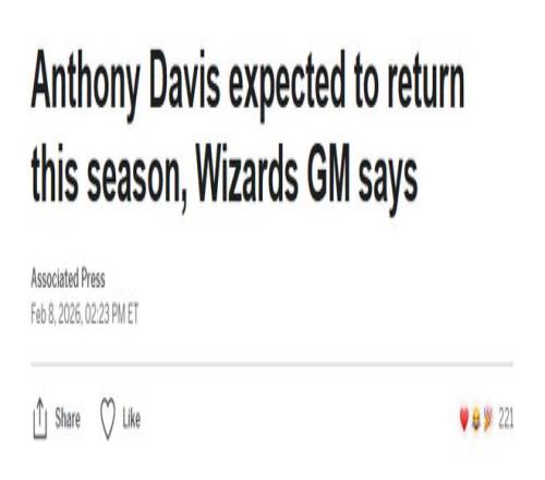 北京時間2月9日,奇才總經理威爾-道金斯表示,他預計安東尼-戴維斯本賽季能夠復出,但具體復出時間表將在全明星休賽期后變得更加清晰。