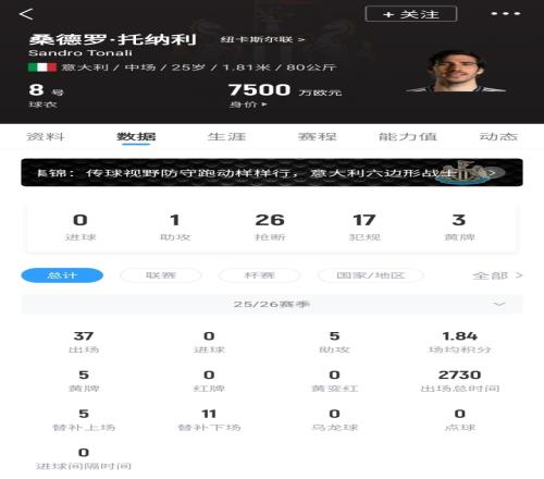 托納利2023年夏窗以6080萬歐轉會費從米蘭加盟紐卡,目前已為球隊出戰94場比賽,貢獻7球8助,德轉身價7500萬歐。