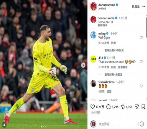 曼城門將多納魯馬補時階段做出關鍵撲救,幫助球隊取勝,賽后他在社交媒體上曬出慶祝勝利的照片,配文:“太棒了!”