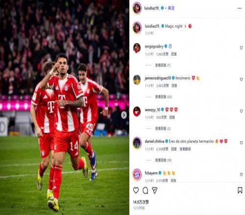 迪亞斯也在賽后通過社媒曬出自己的比賽照,并配文:“魔力之夜!”而他的哥倫比亞國家隊友J羅也現身評論區夸贊:“現象級!”