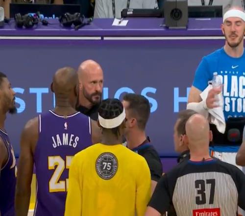 轉播方給到詹姆斯與卡魯索互噴,兩人不知道在爭論什么。隨后杰威上籃直接飛膝撞海斯腹溝股,裁判給進攻犯規雷霆挑戰,段冉:這場至少三次明顯的誤判、漏判不利湖人,但不會出現在裁判報告中。八村三分續命,杰威兩個中投命中,詹姆斯選擇三分不中,斯瑪特犯規湖人無力回天。