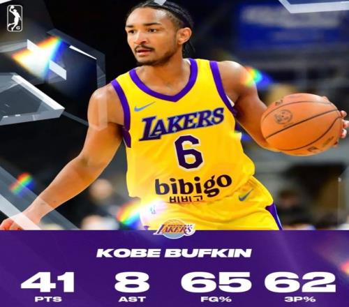 巴夫金的名字確實叫Kobe,他的父母很喜歡科比。巴夫金此前在NBA發展聯盟打球,本賽季為南灣湖人隊打了14場比賽,場均貢獻接近28分,還曾單場轟下41分8助攻,投籃命中率高達65%。