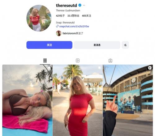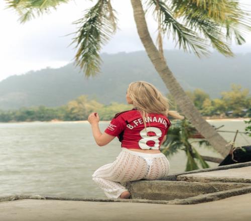 Therese Gudmundsen在Ins上擁有超過30萬粉絲,平時她經常身穿曼聯球衣拍攝寫真。在最新的帖子中,她發布了自己在斯里蘭卡度假的照片,她身穿比基尼躺在沙灘上擺pose拍照,還曬出一張自己享用水果沙拉的照片。