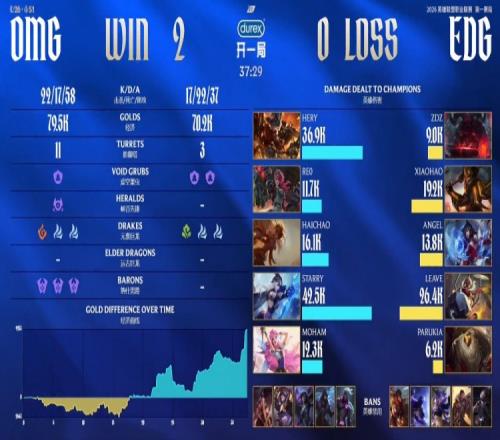 中期大龍團,OMG擊殺Zdz奧恩與Xiaohao皇子,拿到大龍并取得3k領(lǐng)先。后續(xù)Starry艾希與Haichao巖雀連續(xù)擊殺EDG關(guān)鍵人員,OMG推掉EDG兩路水晶,最終re0蔚搶下大龍,OMG推平EDG基地拿到賽點。