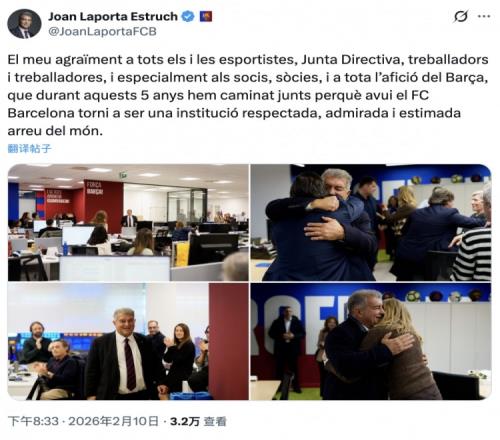 體育播報(bào)2月11日宣 拉波爾塔本周一辭去了巴薩主席職務(wù),他在周二社媒上發(fā)布圖文,告別俱樂(lè)部員工。