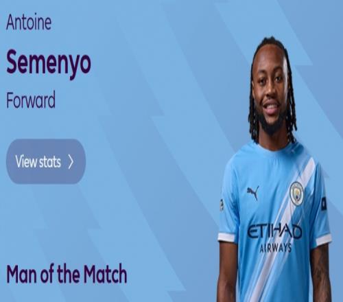 本場比賽塞梅尼奧首發(fā)傳射建功,賽后他也當(dāng)選英超官方球迷票選全場最佳球員。