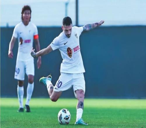 大連英博隊新援斯坦丘(右)在熱身賽中主罰任意球。 大連英博足球俱樂部供圖