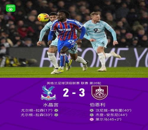 北京時間2月12日英格蘭足球頂級聯(lián)賽 聯(lián)賽 第26輪,水晶宮主場對陣伯恩利。水晶宮尤爾根-拉森梅開二度,萊爾馬自擺烏龍。伯恩利漢尼拔-梅布里破門,杰登-安東尼破門。最終比分水晶宮 2-3 伯恩利。
