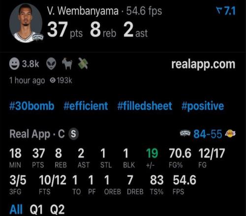 文班亞馬脫下袈裟大開殺戒,直接就把湖人當日本人整,開場8分鐘,9投8中,轟下25分3板;