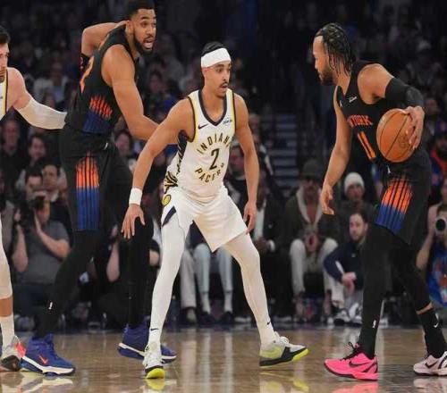 尼克斯上一場客場111-89大勝凱爾特人,步行者過去4場連輸火箭、爵士、雄鹿與猛龍遭遇4連敗,本賽季首次交鋒尼克斯客場114-113險勝步行者。本場尼克斯缺少阿奴諾比、麥克布萊德與羅賓遜,步行者缺少祖巴茨、哈利伯頓、托平等。首節開局尼克斯9-3領先,并在之后維持12-5領先,步行者一波8-0攻勢反超,尼克斯纏斗至14-16落后。尼克斯內外開花一波8-0攻勢反超,西亞卡姆與內姆哈德連續得分,尼克斯26-27被反超。雙方繼續交替領先纏斗,首節結束尼克斯33-32領先步行者。首節步行者三分17中7,西亞卡姆7中4得到10分;尼克斯三分9中3,布倫森8中4得到11分。