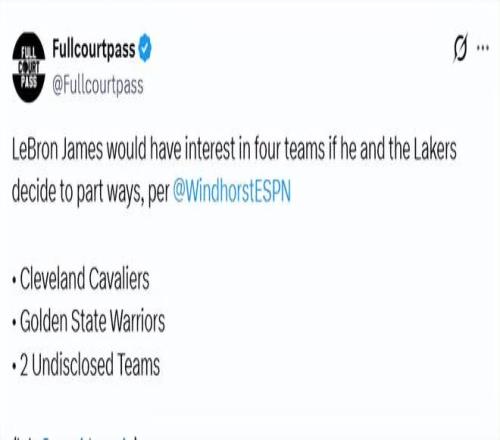 北京時間2月12日,ESPN名記文霍斯特在播客節目上談到了詹姆斯的未來。他表示,如果詹姆斯和湖人在休賽期分手,他有興趣加盟三到四支球隊,騎士和勇士在其中,另外一兩支暫時不方便透露。