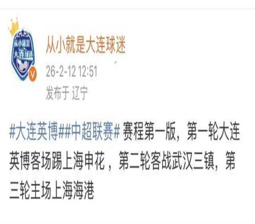 賽程上,大連英博開局場場硬仗,據博主《從小就是大連球迷》透露,第一版賽程,大連英博首輪客場對陣上海申花,第二輪客戰武漢三鎮,第三輪迎來首個主場,對陣上海海港。大連今年是拿了去年長春亞泰的劇本,只不過不是三連客,上個賽季,大連英博對陣申花1負1平,與三鎮戰至兩場平局,主客場遭到了上海海港的雙殺,今年開局三連敗也并非沒有可能。