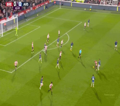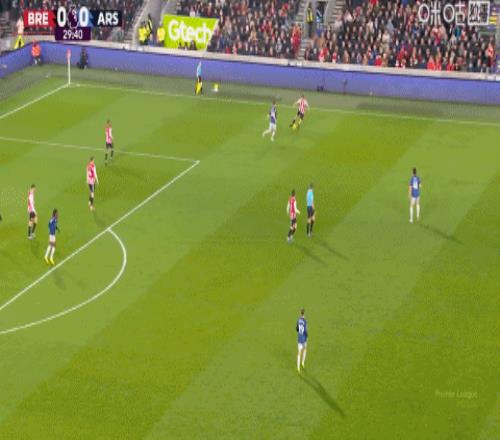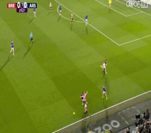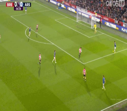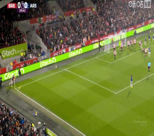 第22分鐘,布倫特福德前場右路邊線球扔到禁區,拉亞得球發起進攻失誤,布倫特福德傳中到禁區,拉亞神撲化解頭球攻門↓
