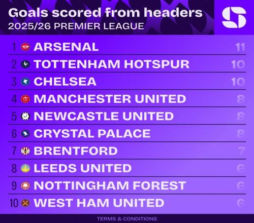 本賽季英超頭球進球榜:阿森納11球最多,熱刺、切爾西10球次席