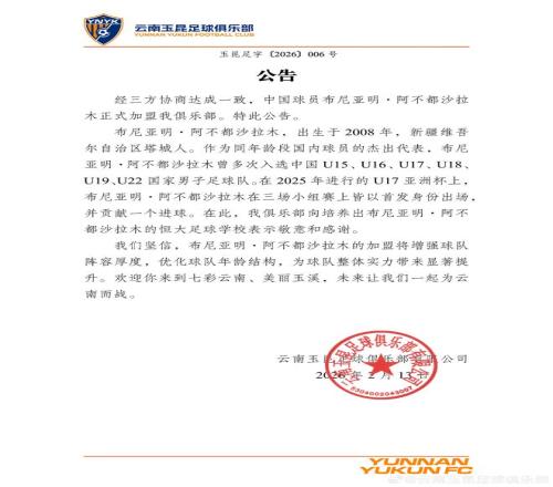 經(jīng)三方協(xié)商達(dá)成一致,中國(guó)球員布尼亞明-阿不都沙拉木正式加盟我俱樂(lè)部。特此公告。