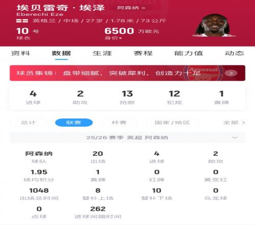 27歲埃澤本賽季為阿森納出場(chǎng)32次,總出場(chǎng)時(shí)間1880分鐘,貢獻(xiàn)5球4助,現(xiàn)身價(jià)6500萬(wàn)歐,他與阿森納的合同至2029年到期。